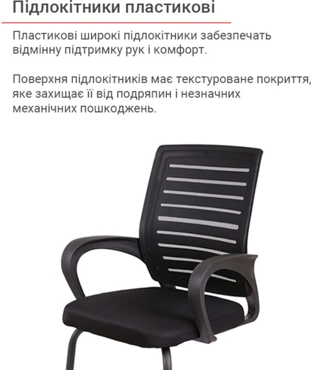 Підлокітники. Пластикові підлокітники в даному кріслі мають особливу вигнуту форму, яка відмінно доповнює стиль крісла і забезпечує рукам надійну опору. Підлокітники досить масивні, з плоскою верхньою частиною. Поверхня пластика текстурована, приємна на дотик, щоб руки не зсковзувал. Висота підлокітників в нижньому положенні сидіння дозволяє наблизити крісло впритул до столу для збільшення вільного простору.