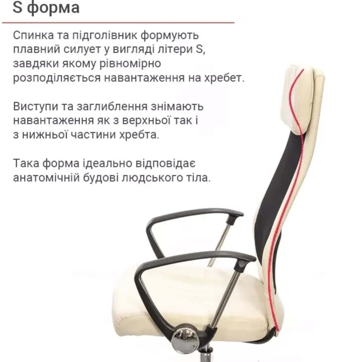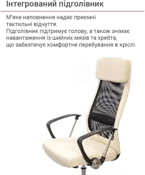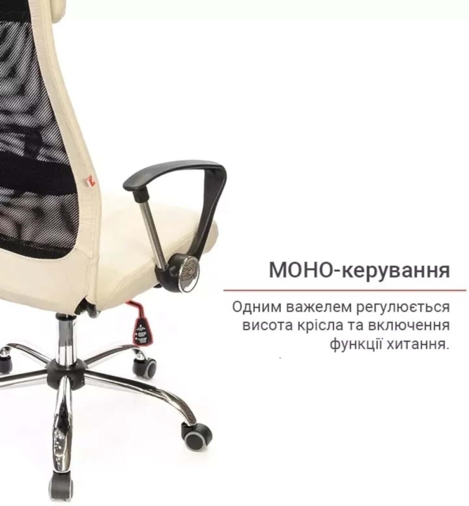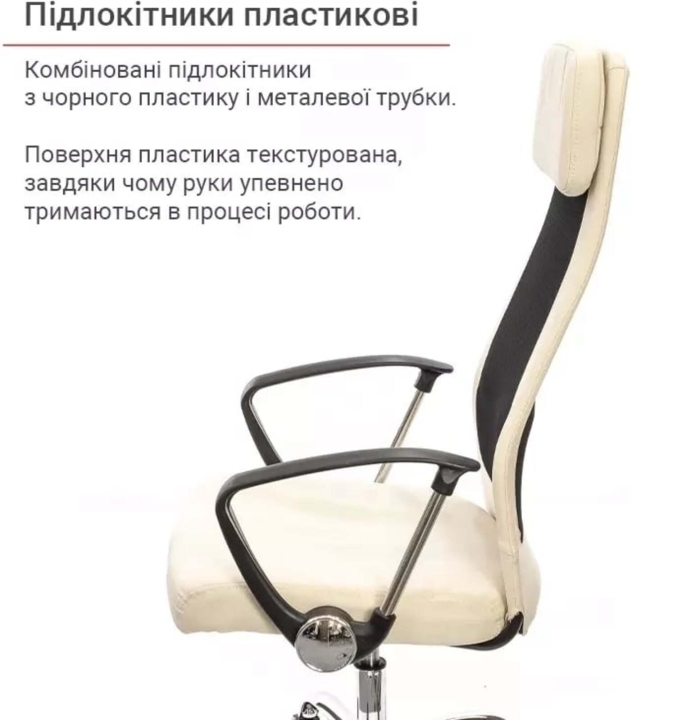 Підлокітники. У даній моделі стильні комбіновані підлокітники з чорного пластику і металевої труби. Поверхня пластика текстурована, завдяки чому руки не зісковзують в процесі роботи. Металева вставка гармонує з хромованою хрестовиною, створюючи єдиний неповторний ансамбль. В нижньому положенні сидіння крісла підлокітники мають висоту, яка дає можливість задвинути крісло під робочий стіл для звільнення навколишнього простору.