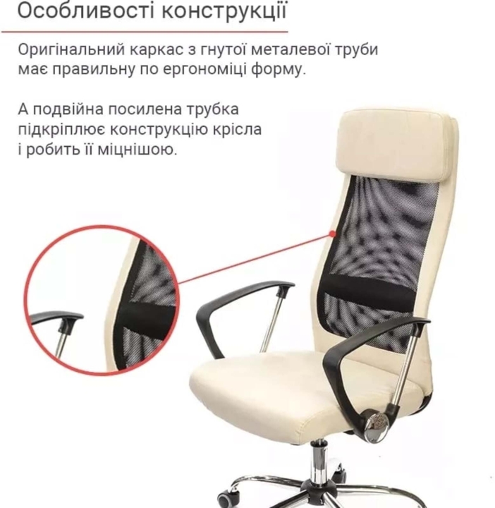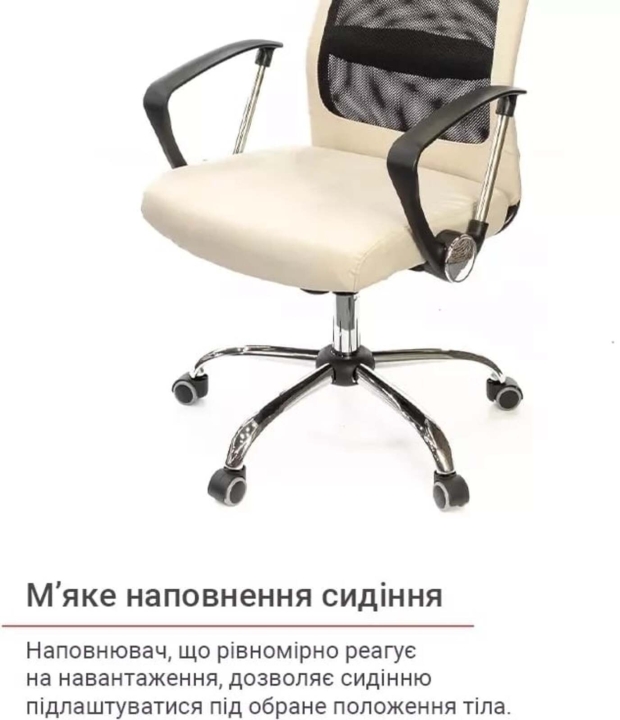 Оббивка. В якості оббивки в даній моделі використана нейлонова сітка та тканина. Ці матеріали відмінно зарекомендували себе при інтенсивному використанні в офісі завдяки еластичності, високій повітропроникності, міцності і зносостійкості. Сітчаста спинка легко пропускає повітря, а значить сидіти в такому кріслі дуже комфортно, особливо в спекотну погоду. Вставки з тканини в районі поперекового вигину та підголівника виконують не тільки декоративну, але і практичну функцію.