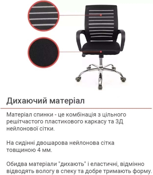 Оббивка. Модель має комбіновану оббивку: двошарову нейлонову тканину на сидінні та нейлонову сітку на спинці. Обидва матеріали «дихають» та еластичні, чудово відводять вологу в спеку та добре тримають форму. А це дуже важливо для облаштування робочого місця персоналу. За своєю структурою вони схожі, тільки тканина доповнена підкладкою, щоб збільшити міцність та зносостійкість сидіння в процесі експлуатації.