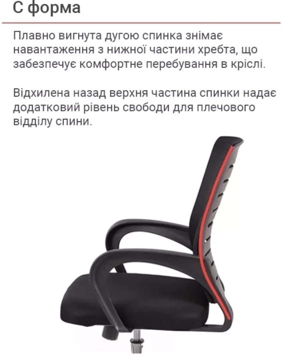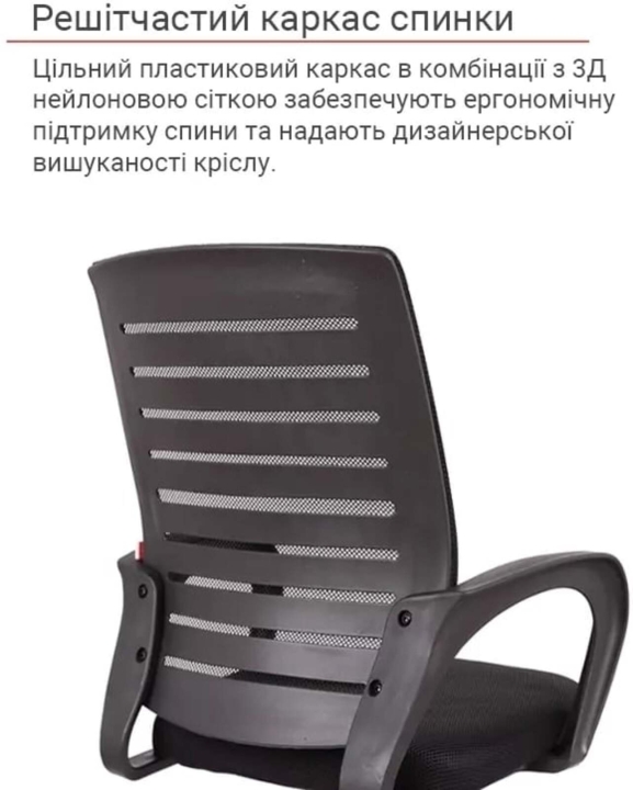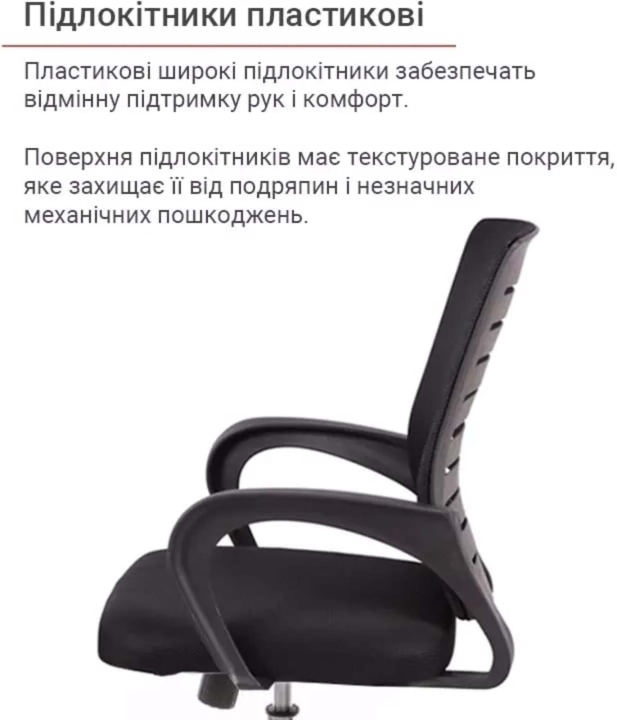 Підлокітники. Нерегульовані пластикові підлокітники мають особливу вигнуту форму, чудово доповнюють стиль крісла та забезпечують рукам надійну опору. Поверхня підлокітників текстурована, приємна на дотик, щоб руки не зісковзували під час роботи.