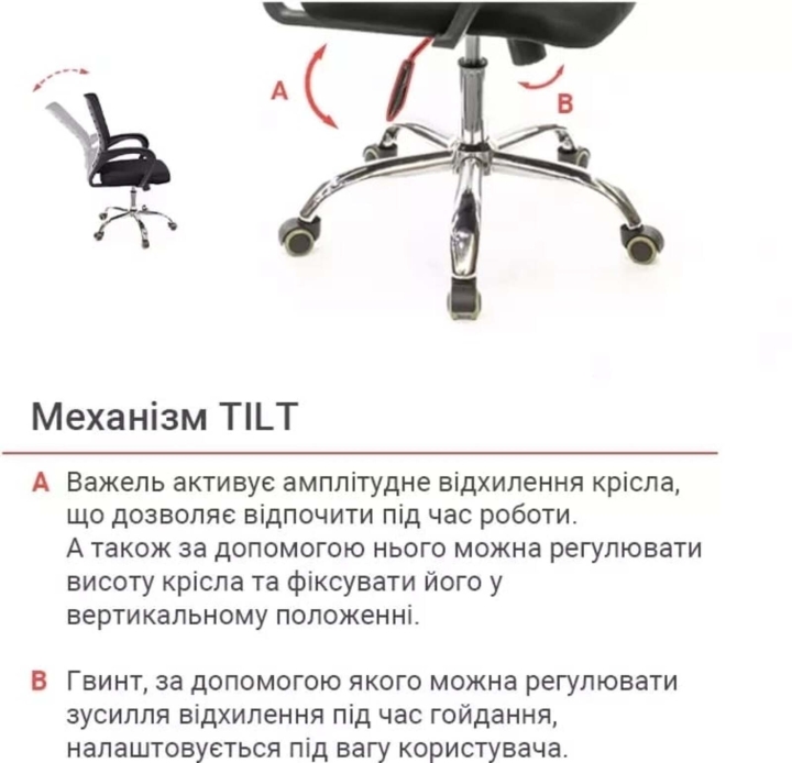 Механізми. Встановлений у моделі механізм гойдання тілт дозволяє хитатися. Жорсткість хитання налаштовується під вагу користувача за допомогою декоративної ручки під сидінням. Газліфт регулює висоту посадки.