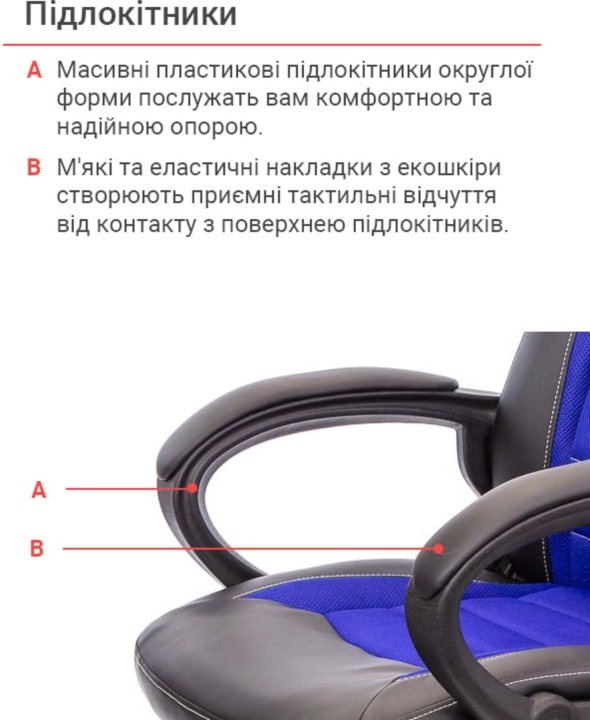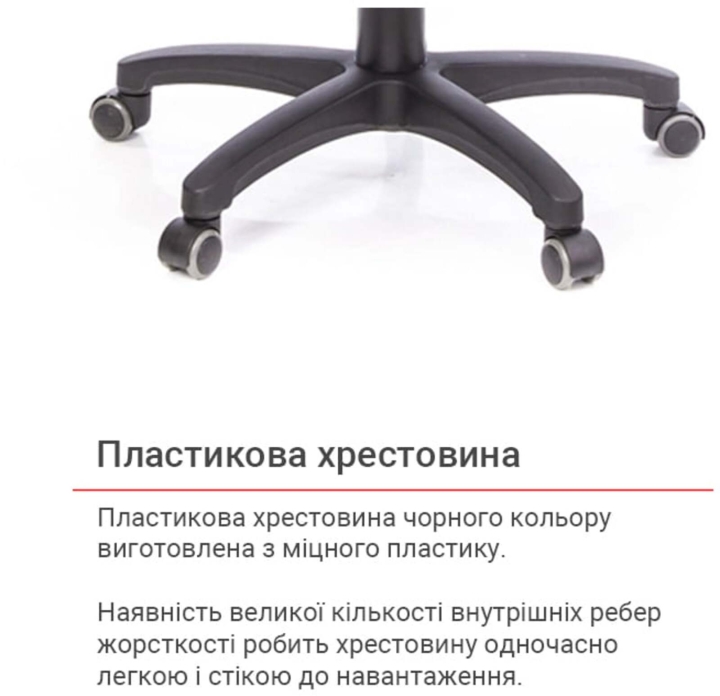 Підлокітники. У даній моделі встановлені масивні пластикові підлокітники округлої форми. М'які накладки подарують вашим рукам комфортну і надійну опору. Гарний чорний колір пластику відмінно гармонує як з оббивкою, так і з хрестовиною, що робить зовнішній вигляд крісла лаконічним і завершеним. Висота підлокітників дозволяє задвинути крісло під робочий стіл стандартної висоти, що звільняє навколишній простір.