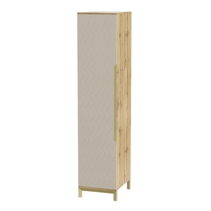 Компактний вузький пенал, що може вміститись у куток чи нішу. Приемний на дотик фасад дверцяток та оригінальні металеві акценти. Він пасуватиме до Вашої кімнати.