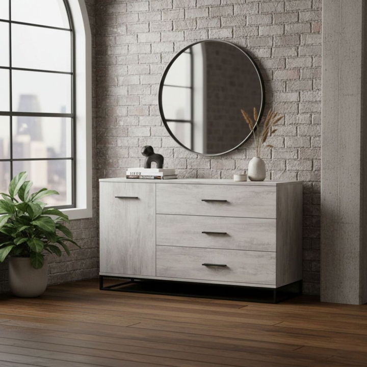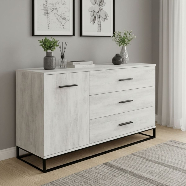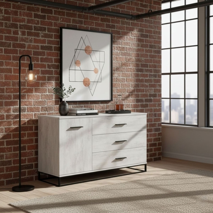 Комод в стиле лофт – это максимум удобства, организованности и утонченной простоты. В нем легко разместится приличное количество вещей, решив вопрос хранения практически и эстетично. Комод Ascet 1200 оснащен тремя вместительными выдвижными ящиками и дополнительной боковой секцией, закрытой дверцей. Корпус и фасады выполнены из ламинированной ДСП 16 мм толщиной, а стойкость конструкции обеспечивает цельнометаллическая опора из трубы 10х30 мм. Это прочная, надежная и выносливая мебель универсального применения, которая будет уместна и в спальне, и в гостиной, и в столовой, и в гардеробной комнате.
