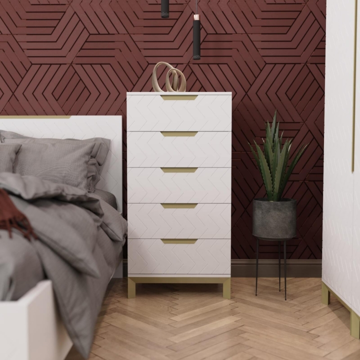 Комод, що виглядає оригінально та актуально. Поверхня висувних ящиків вкрита матеріалом «софт-тач», що приємний на дотик, наче оксамит. Ящики зачиняються легким поштовхом, завдяки доводчикам, а приховані направляючі дозволяють зберегти привабливіший зовнішній вигляд. Комод обладнано п’ятьма висувними ящиками. Унікальна металева фурнітура відрізняє моделі цієї колекції та виграшно акцентує увагу.