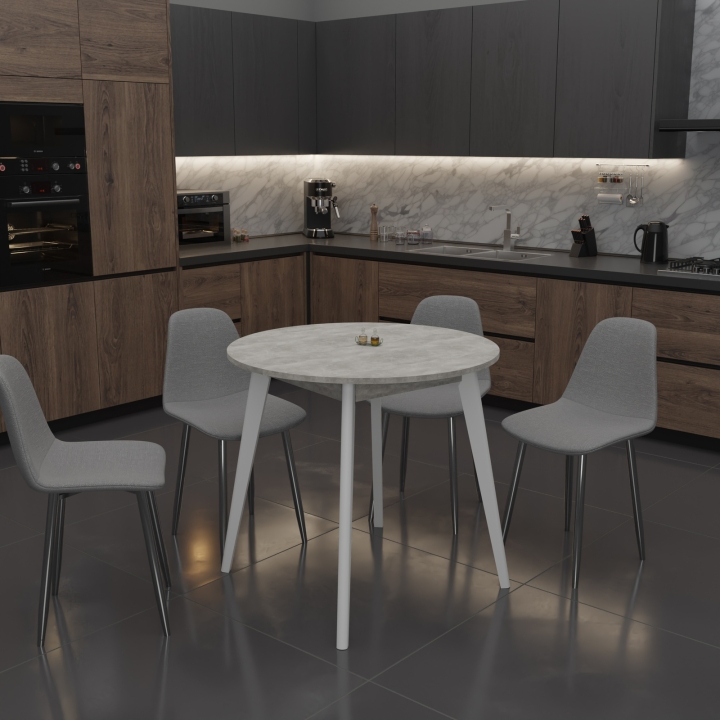 С элегантными габаритными размерами 880 мм в длину, 880 мм в ширину и 750 мм в высоту, этот стол прекрасно вписывается в различные кухонные пространства, обеспечивая комфортное размещение до четырех человек.