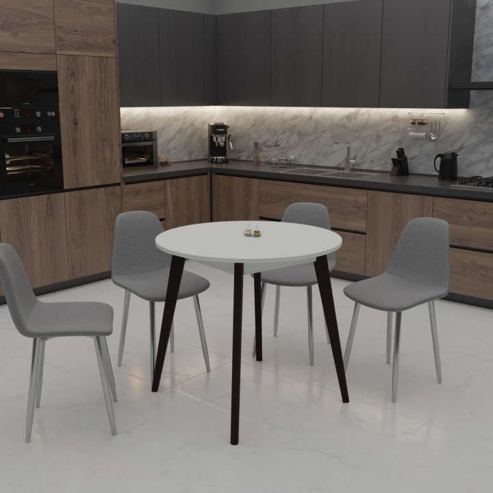 С элегантными габаритными размерами 880 мм в длину, 880 мм в ширину и 750 мм в высоту, этот стол прекрасно вписывается в различные кухонные пространства, обеспечивая комфортное размещение до четырех человек.