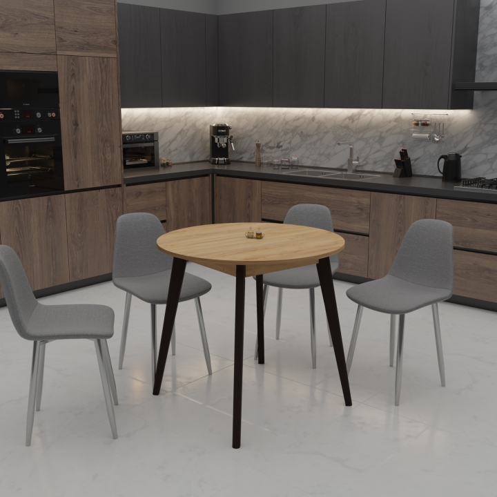 С элегантными габаритными размерами 880 мм в длину, 880 мм в ширину и 750 мм в высоту, этот стол прекрасно вписывается в различные кухонные пространства, обеспечивая комфортное размещение до четырех человек.