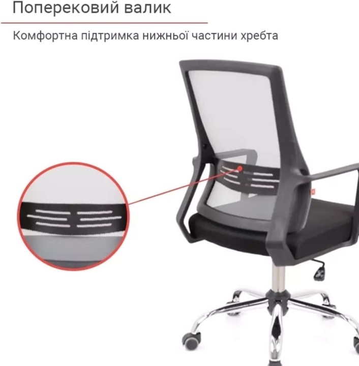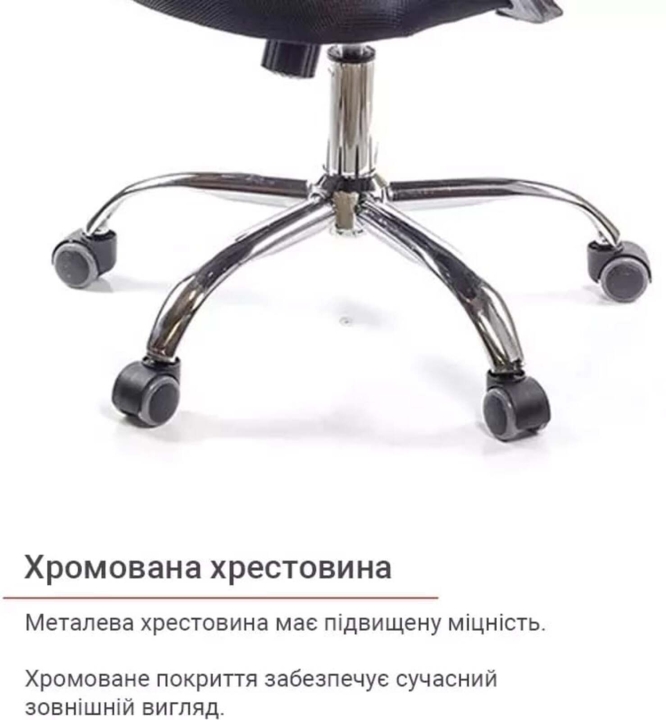 Хрестовина. Металева хрестовина забезпечує крісло міцність та стійкість, вона розрахована на навантаження до 120 кг. Хромована поверхня металу наповнює приміщення благородним блиском. Таке покриття не втратить свою красу з часом, адже воно дуже міцне та стійке до різноманітних зовнішніх факторів. У цій моделі встановлені більш практичні та універсальні прогумовані ролики, які відмінно підійдуть для жорстких покриттів для підлоги, таких як паркет або ламінат.