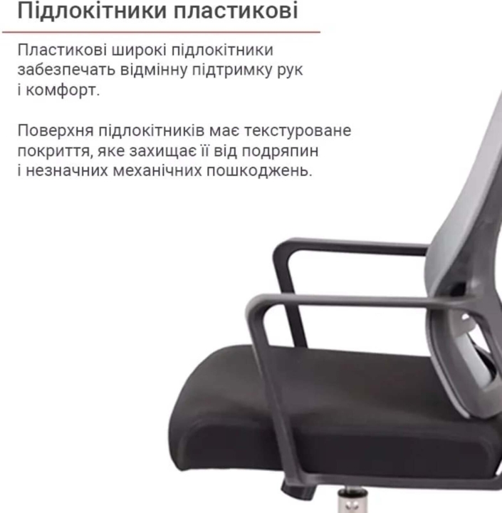 Підлокітники. У цій моделі встановлені пластикові підлокітники зігнутої форми. Масивний товстостінний пластик забезпечує їм міцність та надійність, але й широкі робочі площини дарують рукам зручну опору.