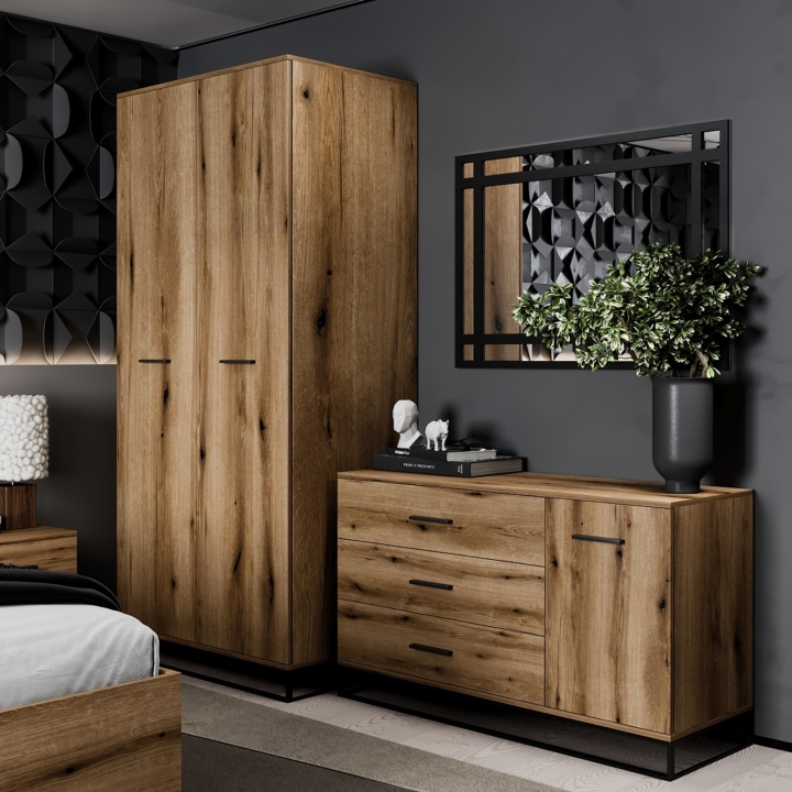 Проста, міцна та містка шафа в стилі лофт – вдале придбання для сучасної спальні. Адже він не лише добре справляється зі своїми безпосередніми функціональними завданнями, а й ефектно доповнює інтер'єр. Шафа Ascet у цьому відношенні просто ідеальна! Його лаконічний дизайн, прямі та чіткі форми, надійна конструкція з суцільнометалевою основою та кольорова гама в дусі лофта забезпечують високі естетичні та практичні характеристики. За двома дверцятами - секція зі штангою для розвішування одягу і дві полиці вгорі і внизу. Все максимально зручно, надійно, ґрунтовно та розраховано на довгі роки експлуатації. Не всі шафи можуть похвалитися такими параметрами!