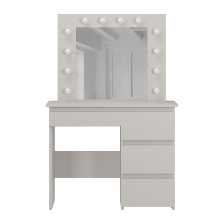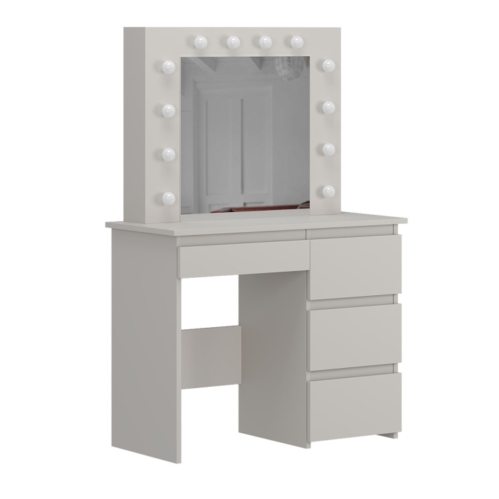 Центральною частиною столика є дзеркало розміром 550x530 мм з 12 LED-лампочками, що забезпечують рівномірне освітлення. Це дозволяє створювати ідеальні умови для нанесення макіяжу чи догляду за обличчям. Лампочки нейтрального кольору, які входять до комплекту, можна легко замінити на теплі чи холодні за вашим бажанням.