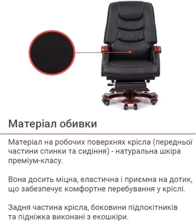 Оббивка. Крісло представлене у натуральній шкірі. Натуральна шкіра найвищої якості – безперечно найкращий вибір для цієї моделі преміум-класу. Переваги даного оббивного матеріалу – міцність, еластичність, хороша тепло- та вологопровідність. Шкіра приємна на дотик, добре пропускає вологу і не ширяє в спеку. Наповнення крісла з якісного поролону досить м'яке, створює почуття комфорту, працювати в цьому кріслі можна годинами, не відчуваючи втоми.