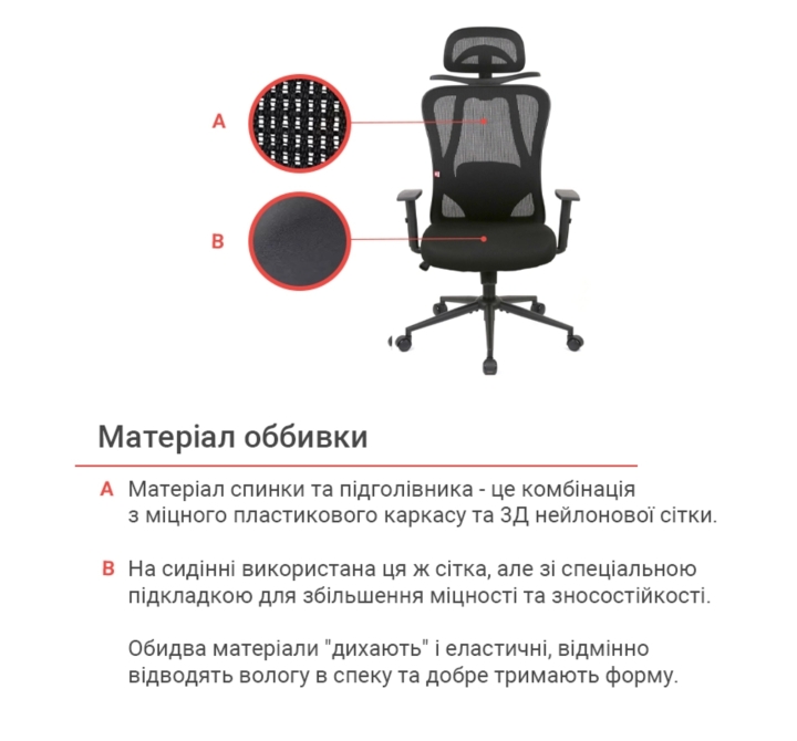 Підлокітники. Ця модель має стильні Т-подібні підлокітники з чорного пластику. Пластик має спеціальне гумове покриття дуже приємне при фізичному контакті з руками. Підлокітники регулюються висотою під ваші особисті потреби.