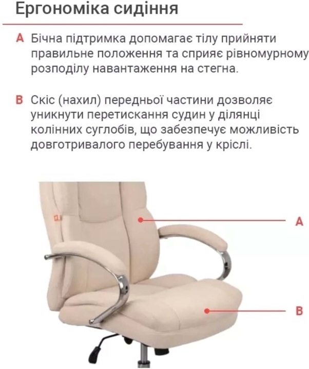 Підлокітники. Підлокітники виготовлені з хромованої металевої труби. Овальна форма підлокітників в комплекті з м'якими накладками будуть служити вашим рукам надійною і комфортною опорою. Вдало підібрані розмір і висота підлокітників дозволять зручно розмістити руки, коли плечі впираються і не втомлюються під час довгого робочого дня.