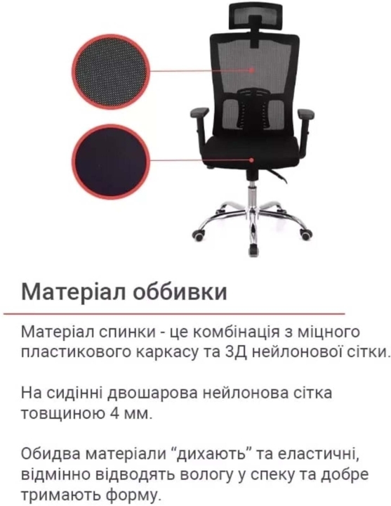 Оббивка. В якості оббивки сидіння використана нейлонова стільникова тканина завтовшки 4 мм. Спинка - з міцної нейлонової сітки, яка надає кріслу легкість і легкість. Обидва ці матеріали "дихаючі" і еластичні, прекрасно відводять вологу в спекотну погоду та відмінно тримають форму, а це просто незамінні якості для матеріалу офісного крісла, яке повинне витримувати великі навантаження в повсякденній експлуатації. За своєю структурою вони схожі, тільки тканина має додаткову підкладку, що збільшує її міцність і зносостійкість.