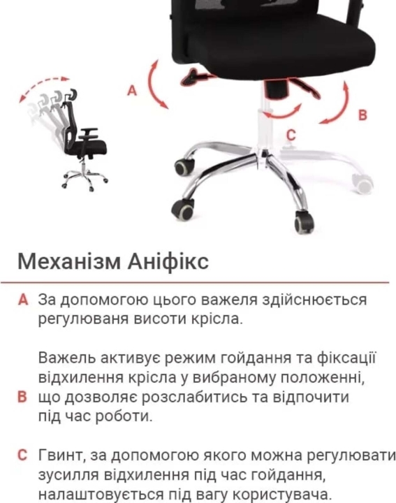 Механізми. Дане крісло оснащене механізмом гойдання Anifix, з фіксацією в будь-якому зручному положенні, який допоможе вам розбавити робочий день хвилинами приємного відпочинку, не відволікаючись від важливих справ. За допомогою газліфта є можливість налаштовувати висоту крісла під конкретні потреби. Завдяки декоративної ручці під сидінням, такий механізм легко налаштовується під вагу користувача, що дозволяє йому працювати виключно безпечно і правильно.
