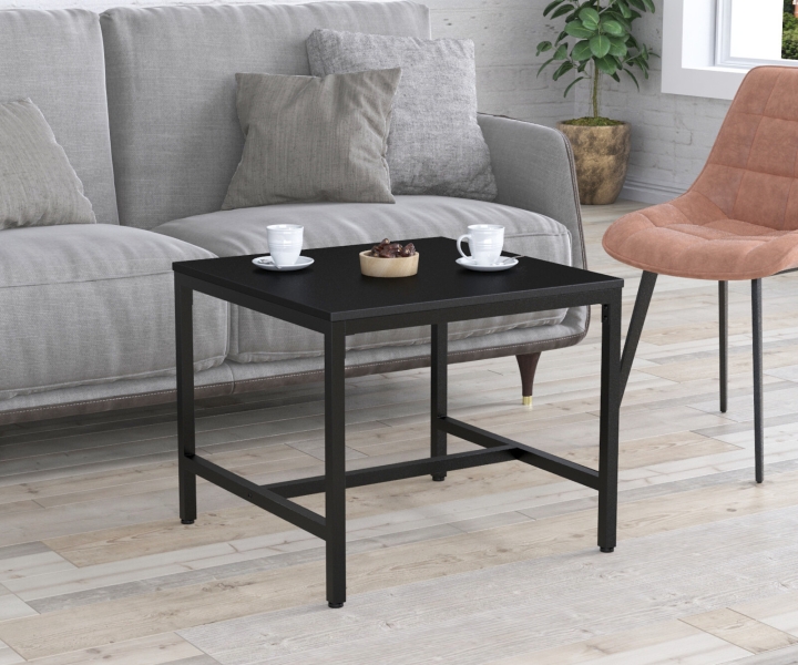 Каркас изготовлен из металлических труб толщиной 25х25 мм. Металл окрашен в черный цвет методом порошкового напыления. Благодаря такому покрытию поверхность металла выглядит более эстетично и имеет длительный срок службы. В основании установлены регулируемые ножки. Они позволят компенсировать все неровности поверхности, а также защитят от возникновения царапин и потертостей на поверхности пола. Столешница изготовлена из качественного ЛДСП. Из представленных цветов вы сможете выбрать именно тот, который подойдет под ваш интерьер. На столешнице можно разместить угощения, ноутбук для работы, чашку кофе и другие предметы.